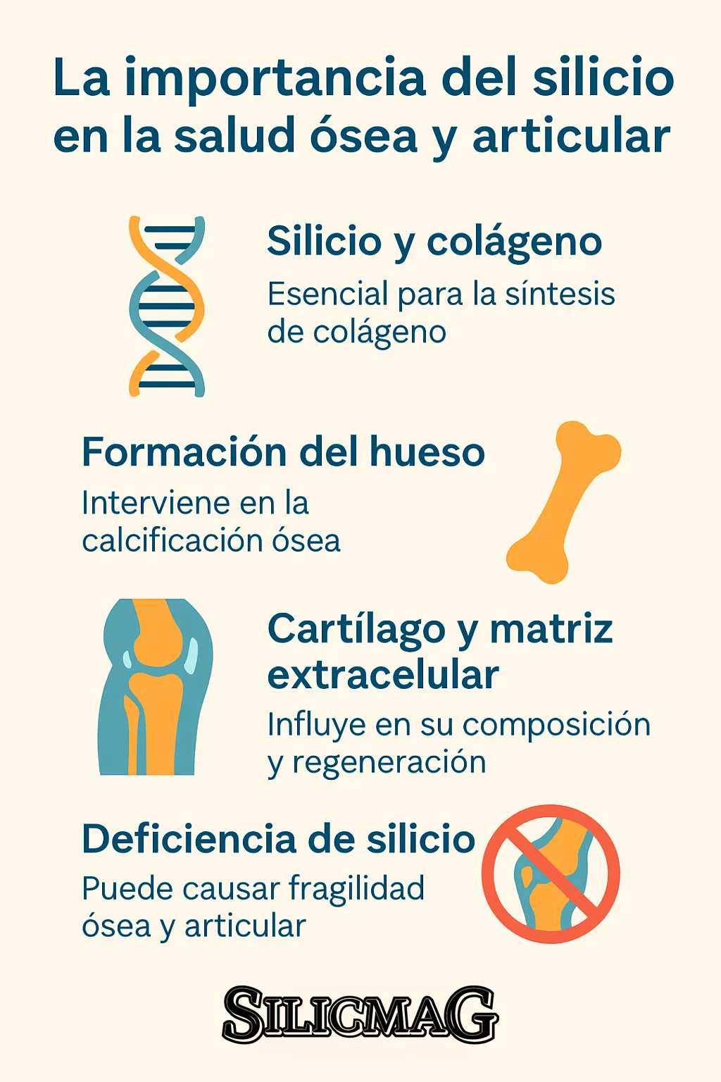 En Silicmag ofrecemos silicio orgánico con alta biodisponibilidad, lo que garantiza su absorción efectiva por el organismo. Apoyamos tu salud ósea y articular con productos respaldados por evidencia científica y formulados para marcar la diferencia desde dentro.